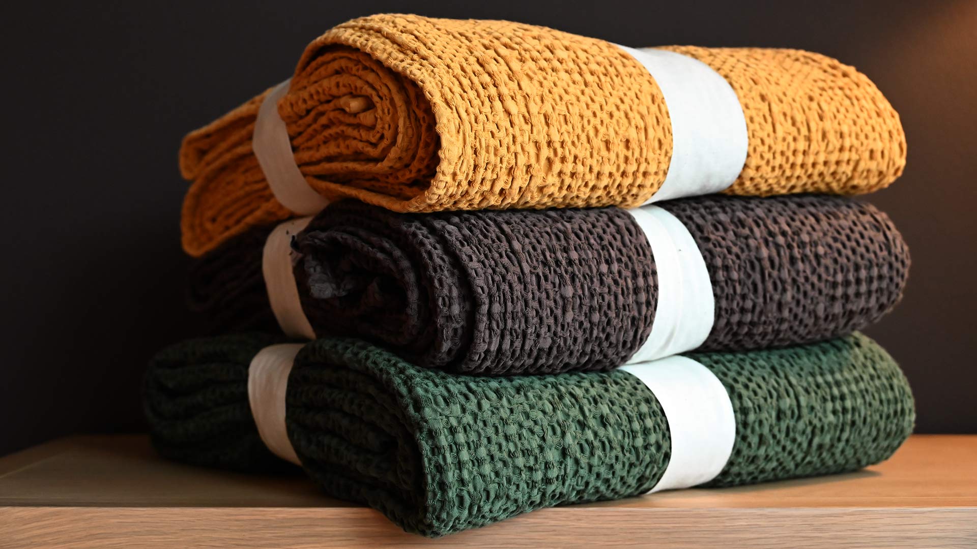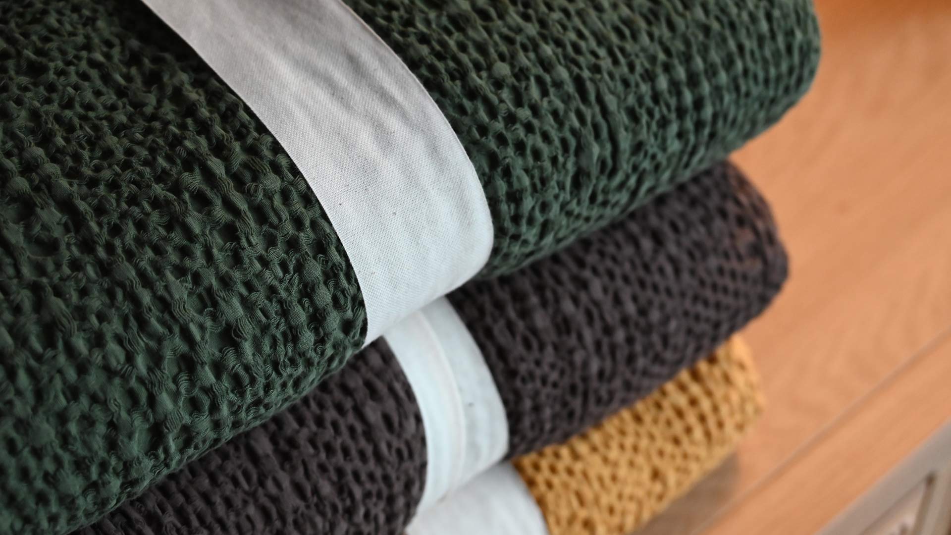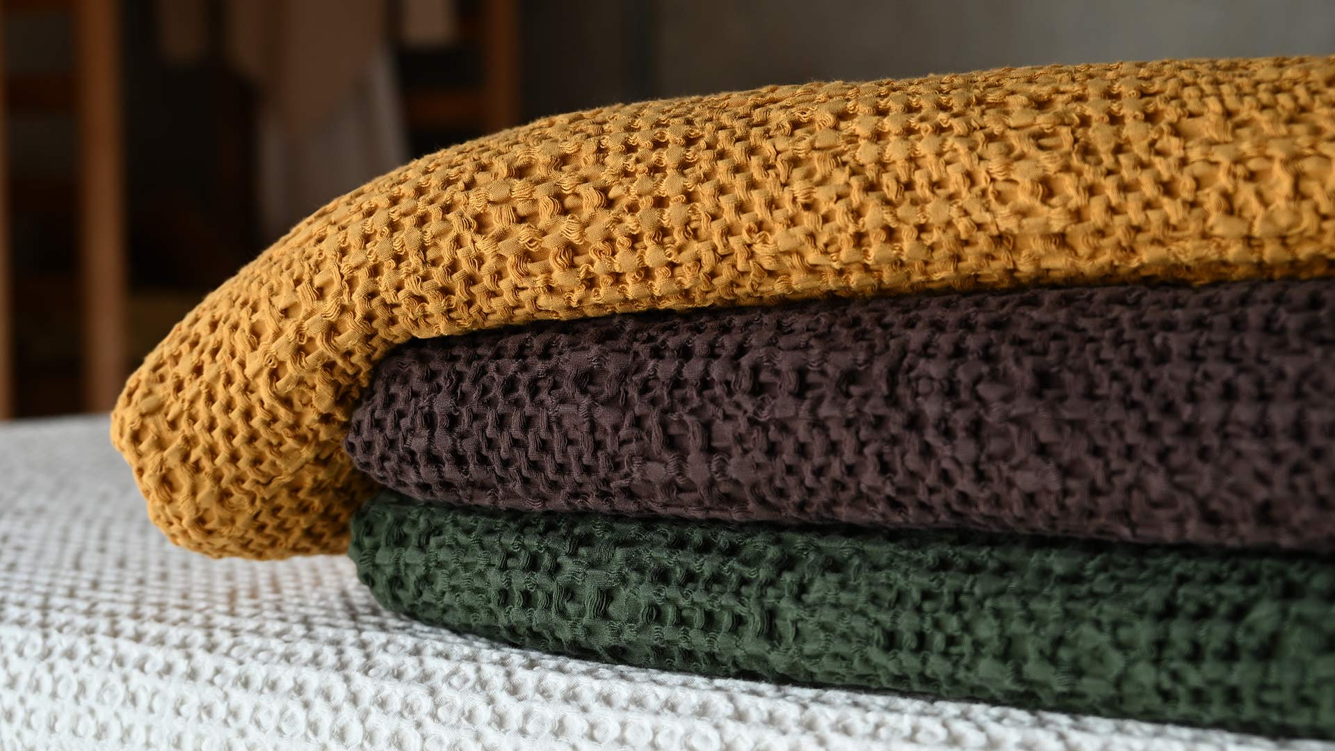 These waffle textured, cotton bedspreads are available in a choice of three contemporary colours: espresso brown, dark olive green or mustard. Made from 100% cotton, they are ideal for use as an additional cover over your bedding in colder months, or with just a flat sheet in the summer. A soft, luxurious bedspread – it drapes beautifully – the textured, waffle design adds interest and warmth.