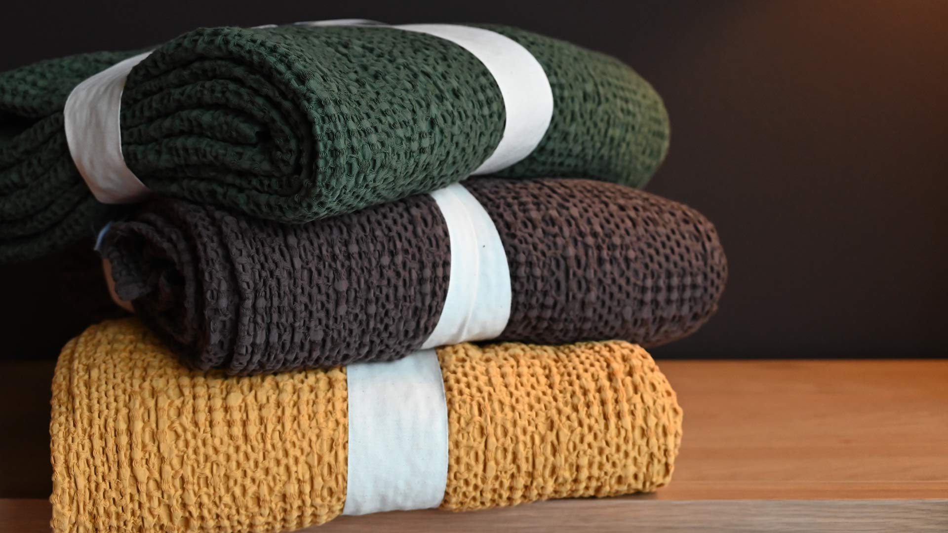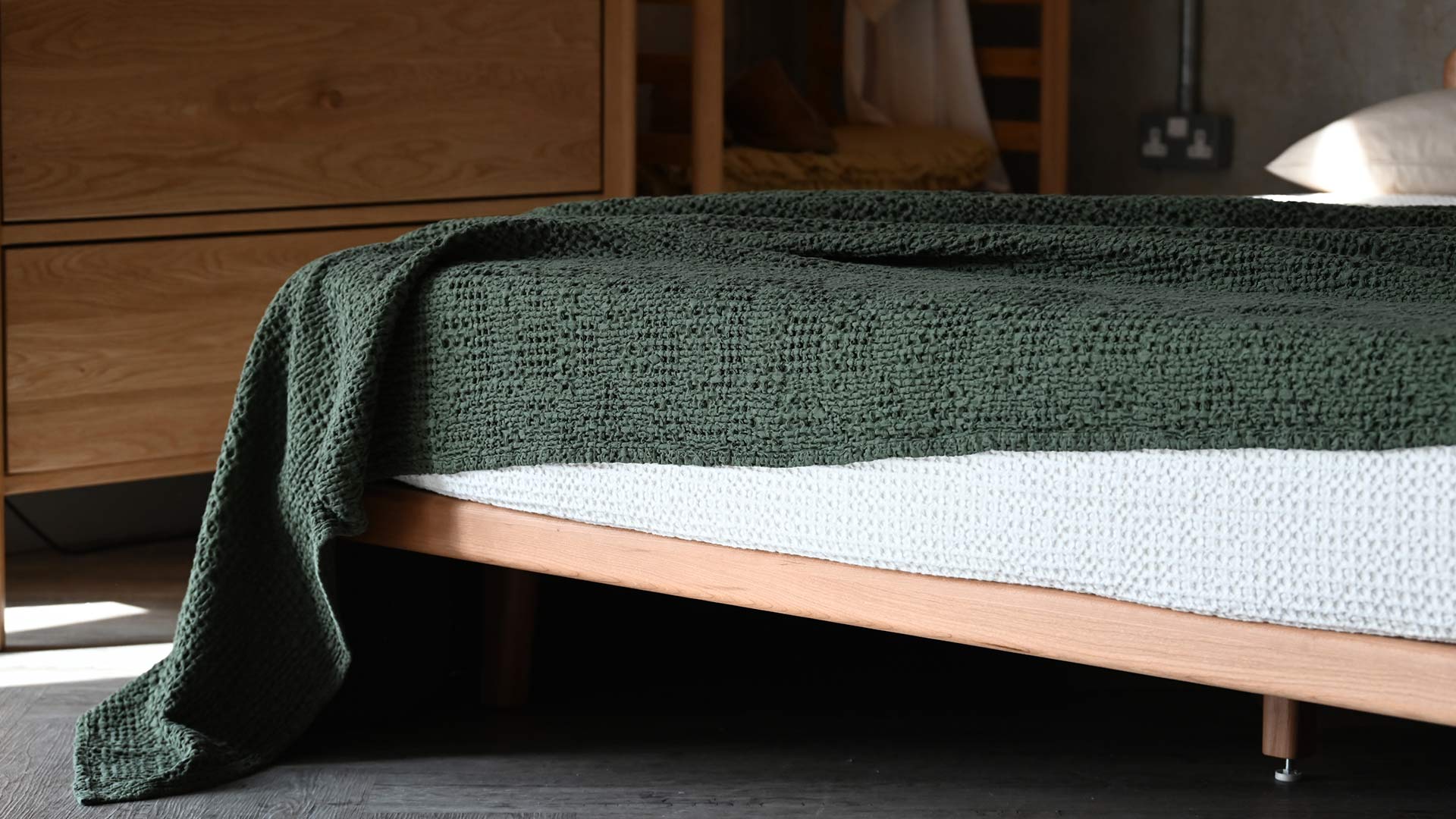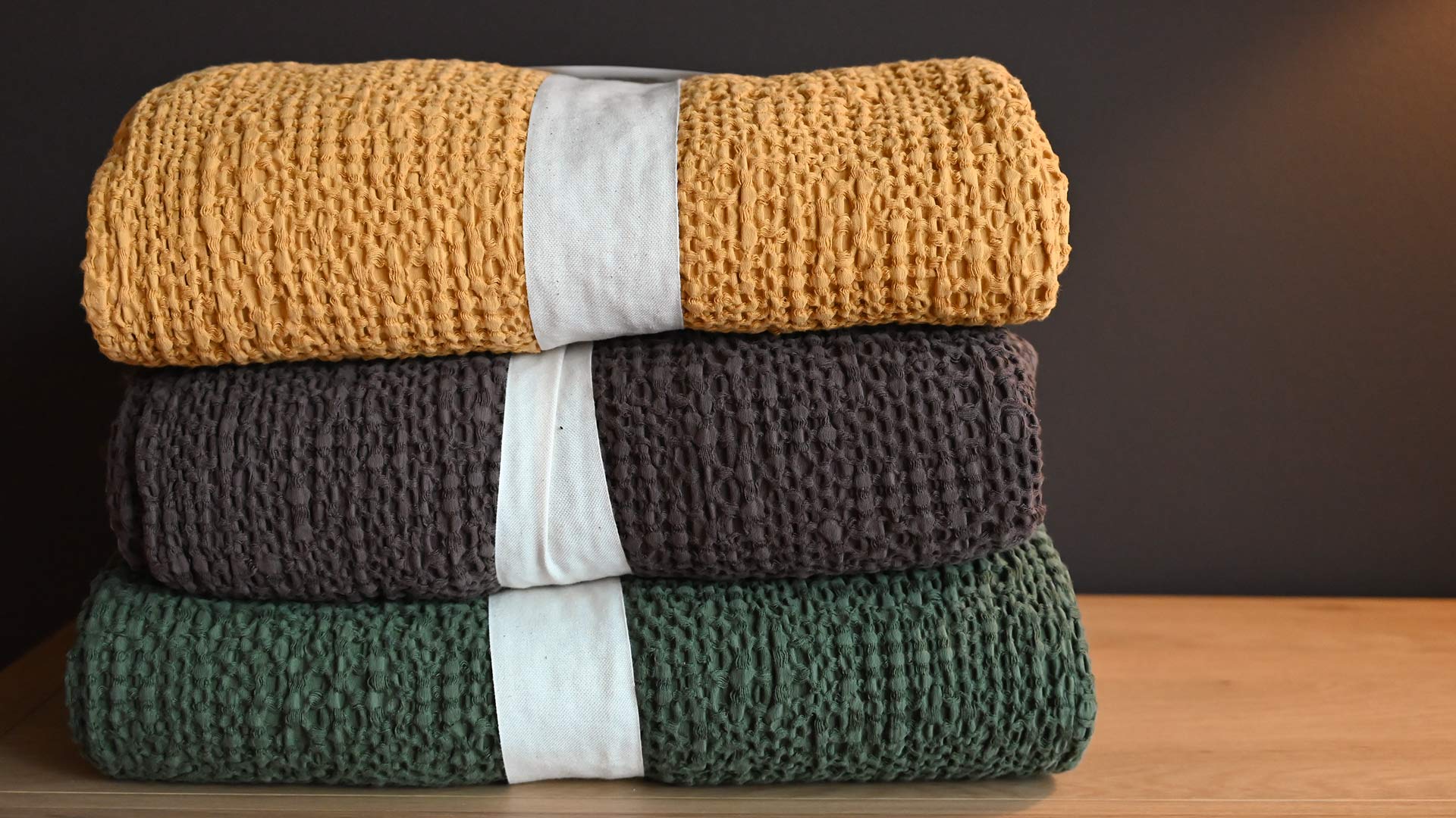 These waffle textured, cotton bedspreads are available in a choice of three contemporary colours: espresso brown, dark olive green or mustard. Made from 100% cotton, they are ideal for use as an additional cover over your bedding in colder months, or with just a flat sheet in the summer. A soft, luxurious bedspread – it drapes beautifully – the textured, waffle design adds interest and warmth.