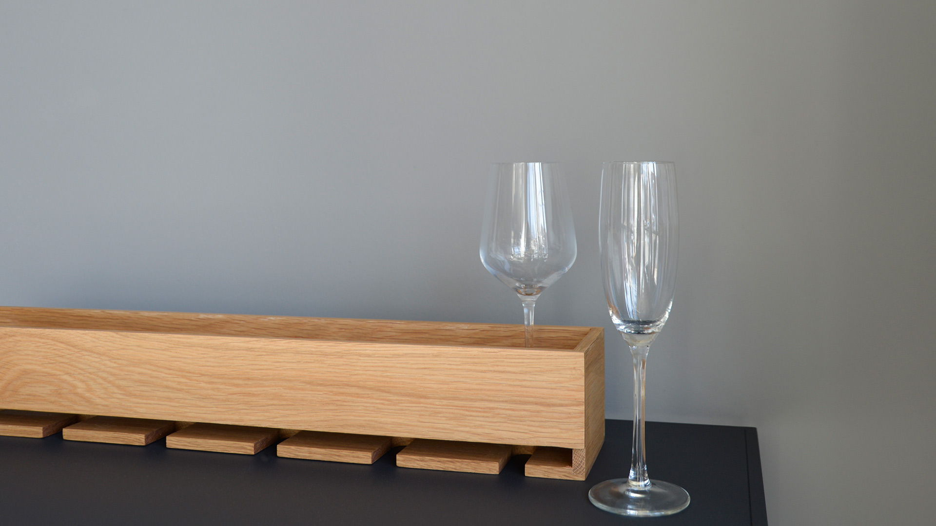 In order to keep the inside of your glassware clean, glasses are stored upside down. Specially designed slots with wood edges prevent damage. Suitable for both wine glasses, champagne flutes and even cocktail glasses. Moreover, the enclosed, deep shelf stops things falling off and can be used to store bottles up to 90mm diameter.