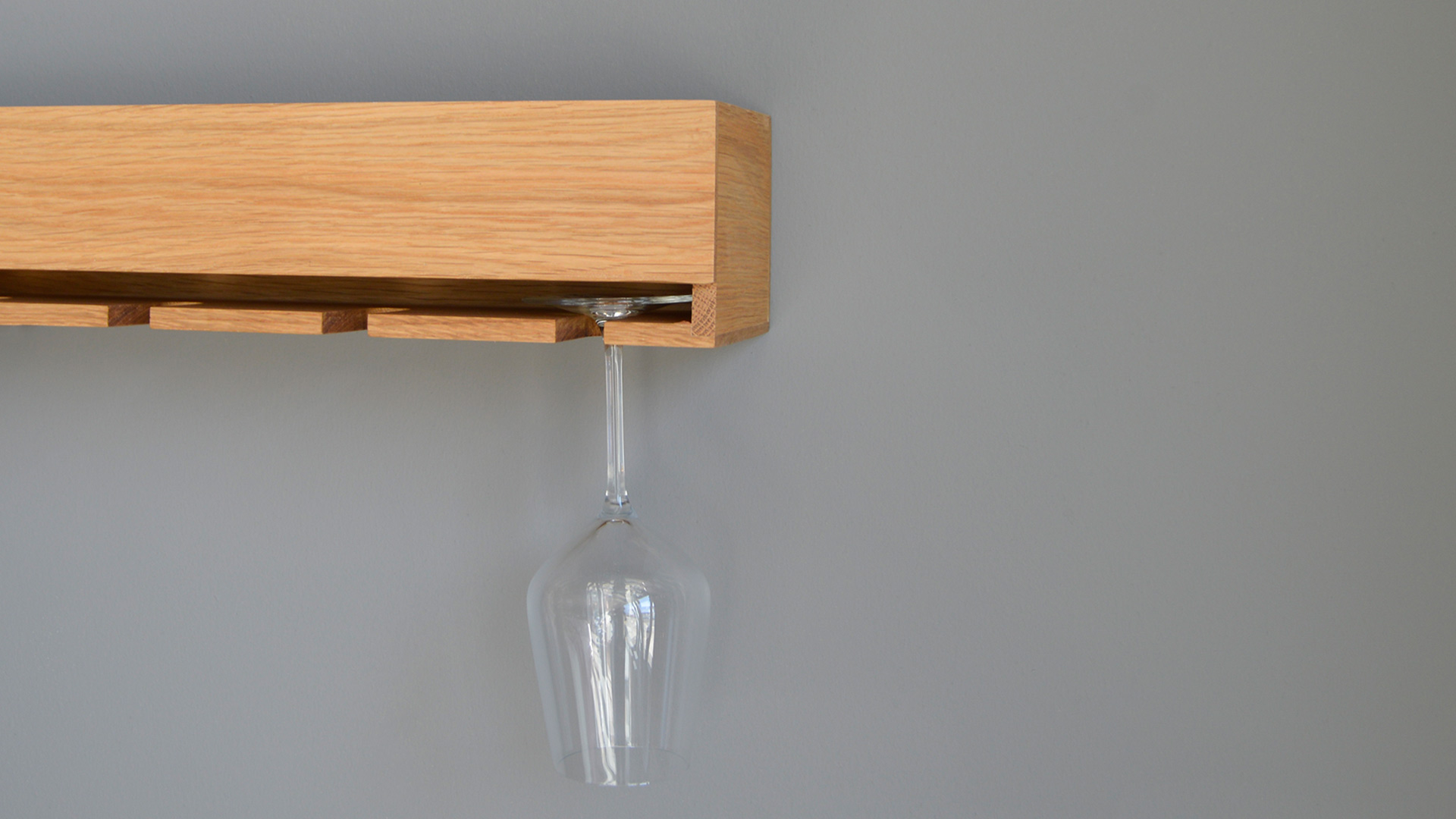 A natural oak, wall mounted, deep shelf with glass holder. This stylish storage unit can take bottles above while up to six glasses can be suspended from the holder below.