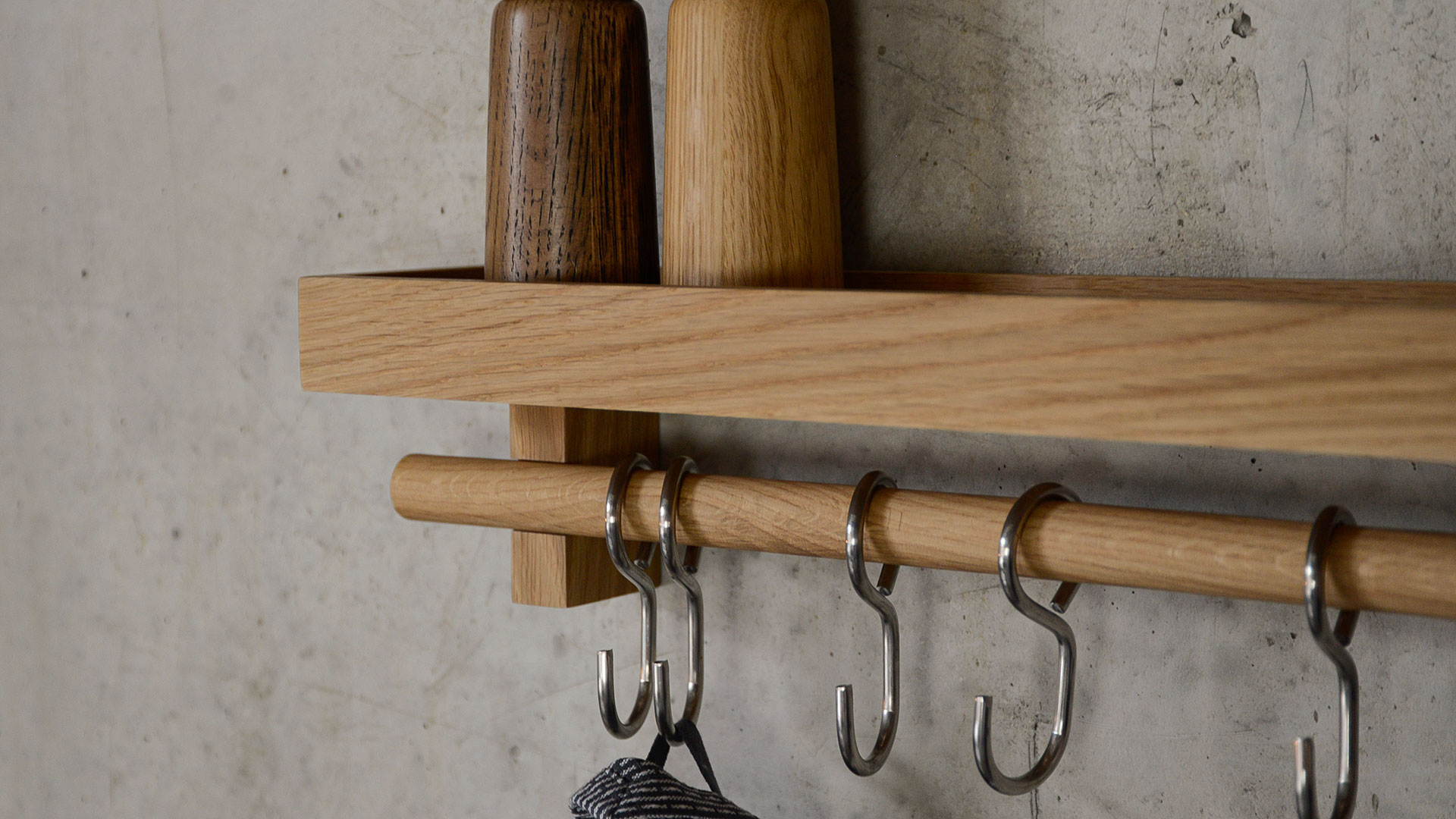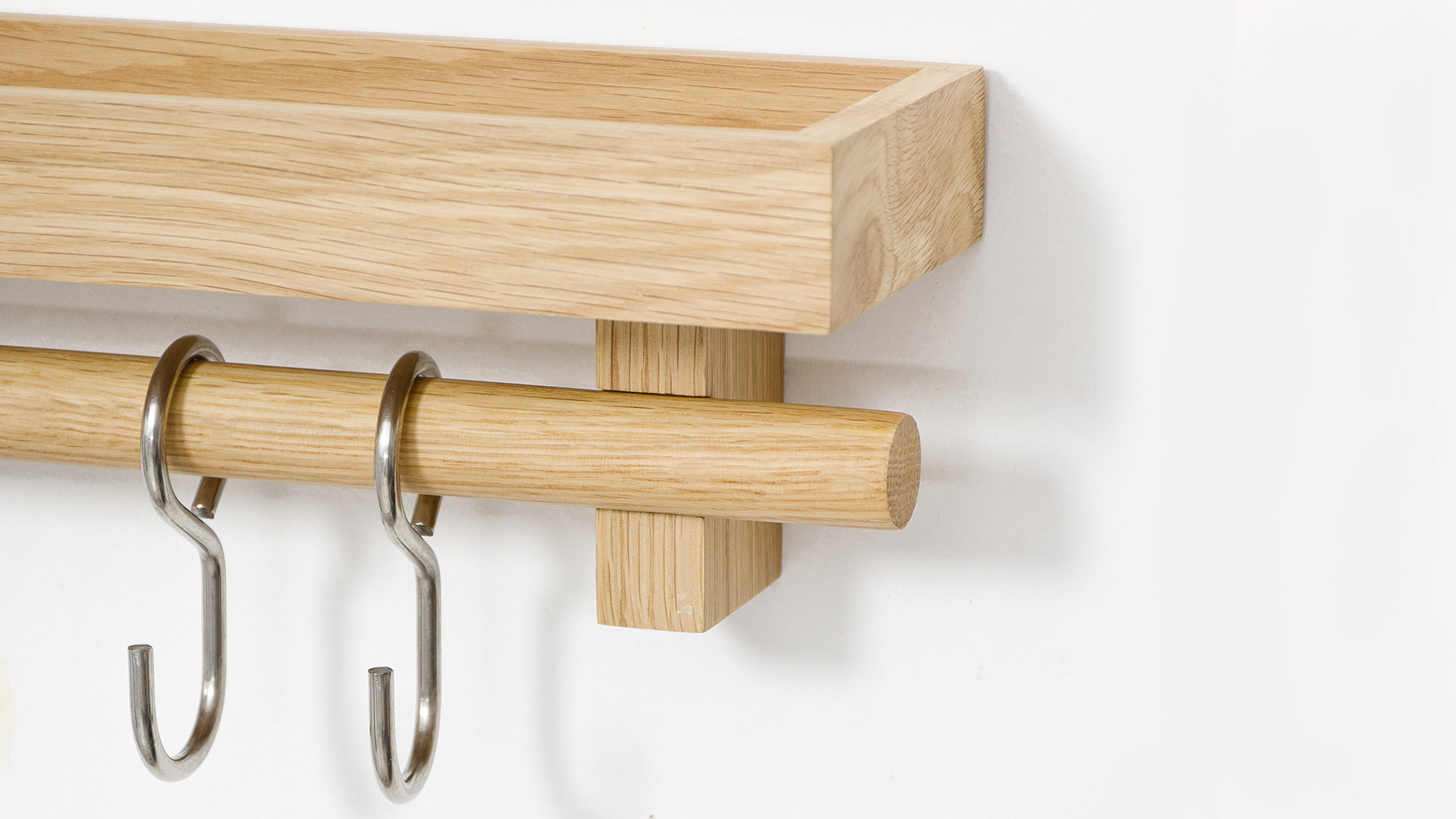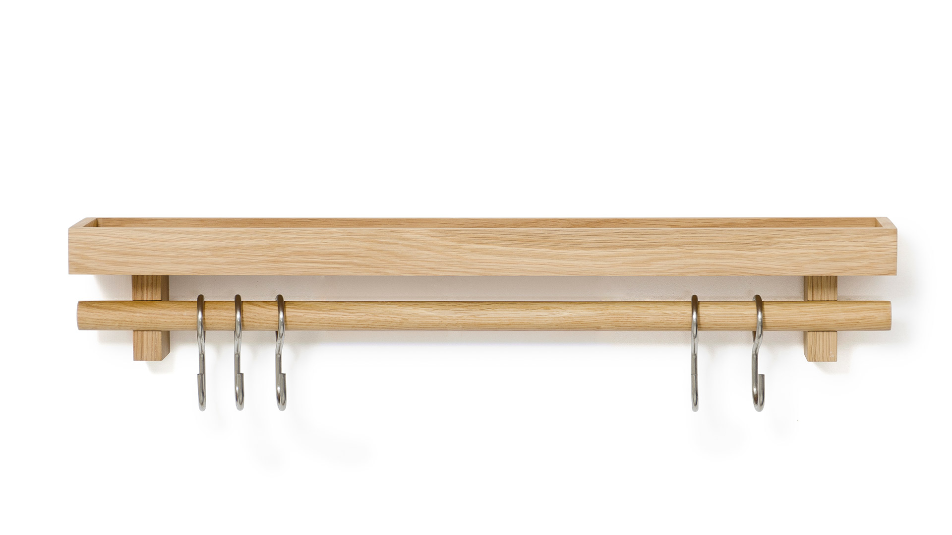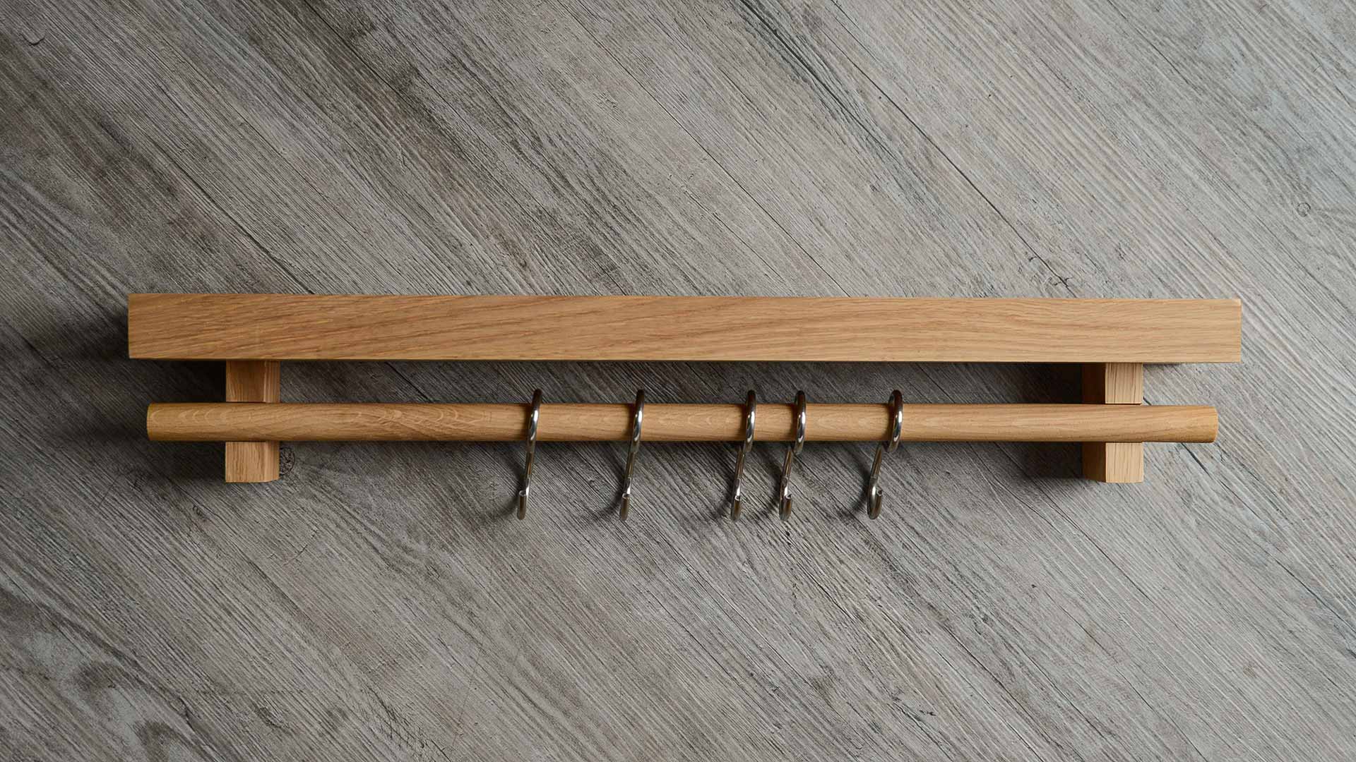 A natural oak, wall mounted, shelf with stainless steel hooks. Free up valuable drawer and cupboard space by hanging pans, utensils, dried herbs, a string of onions or garlic on this wall fixing utensils rail shelf.