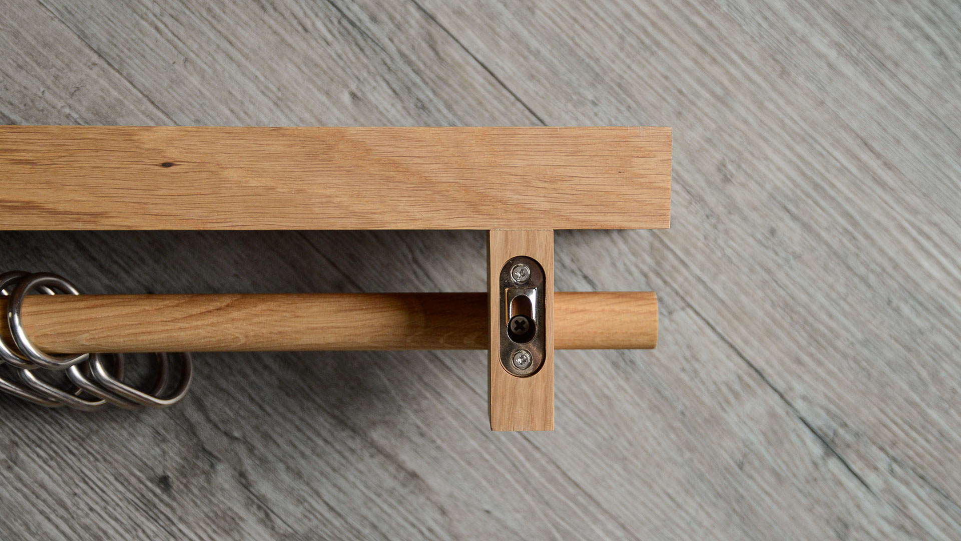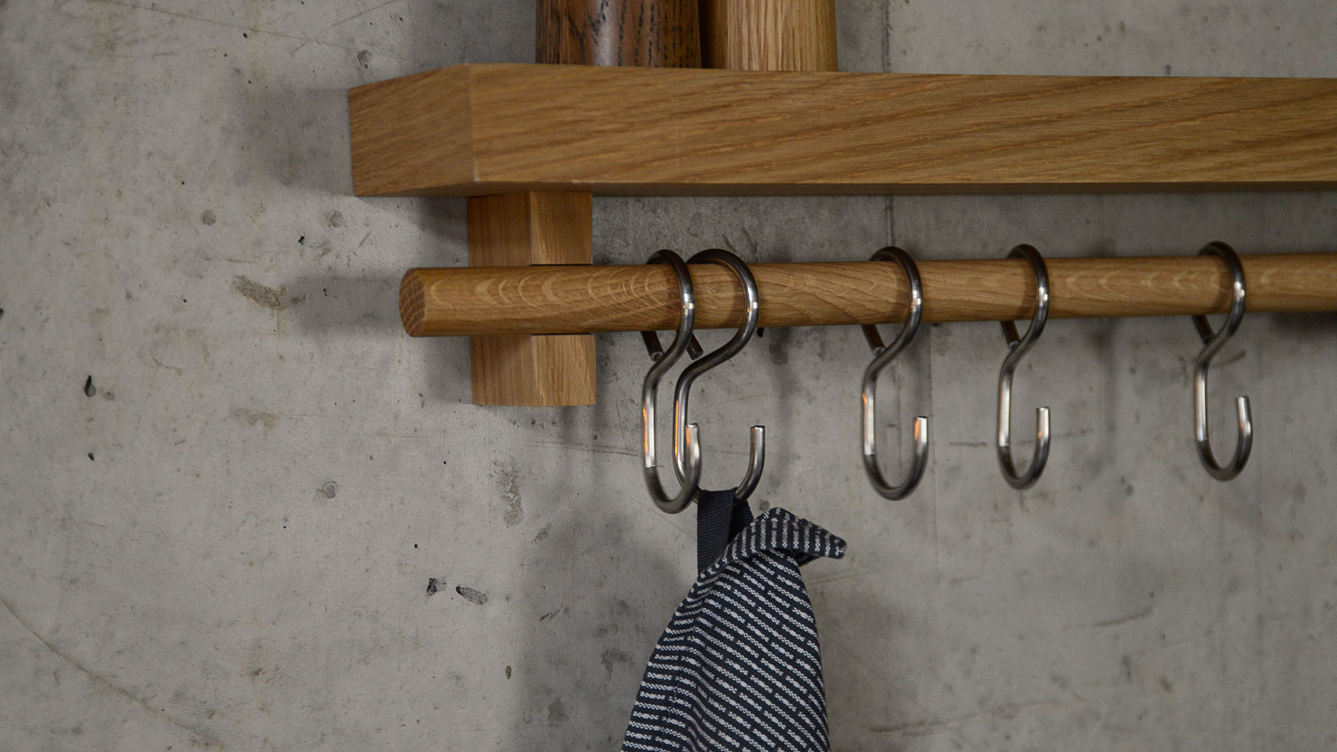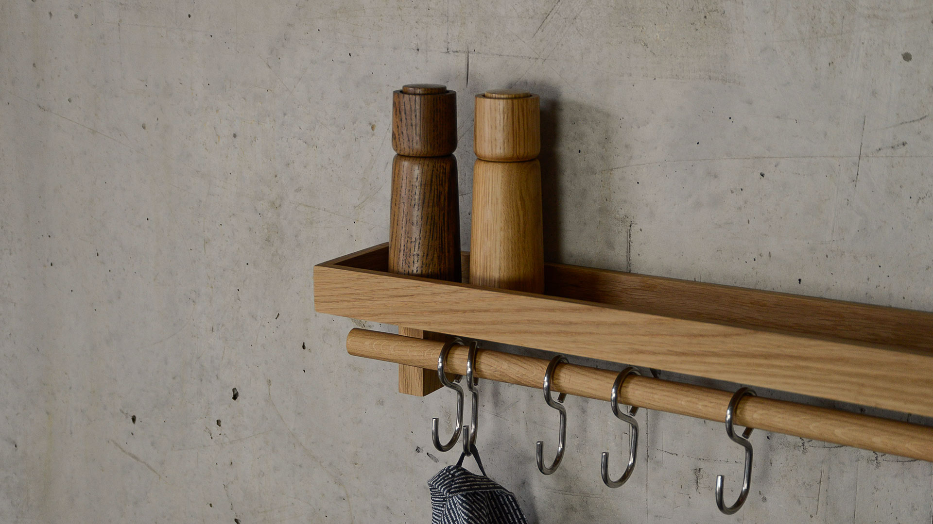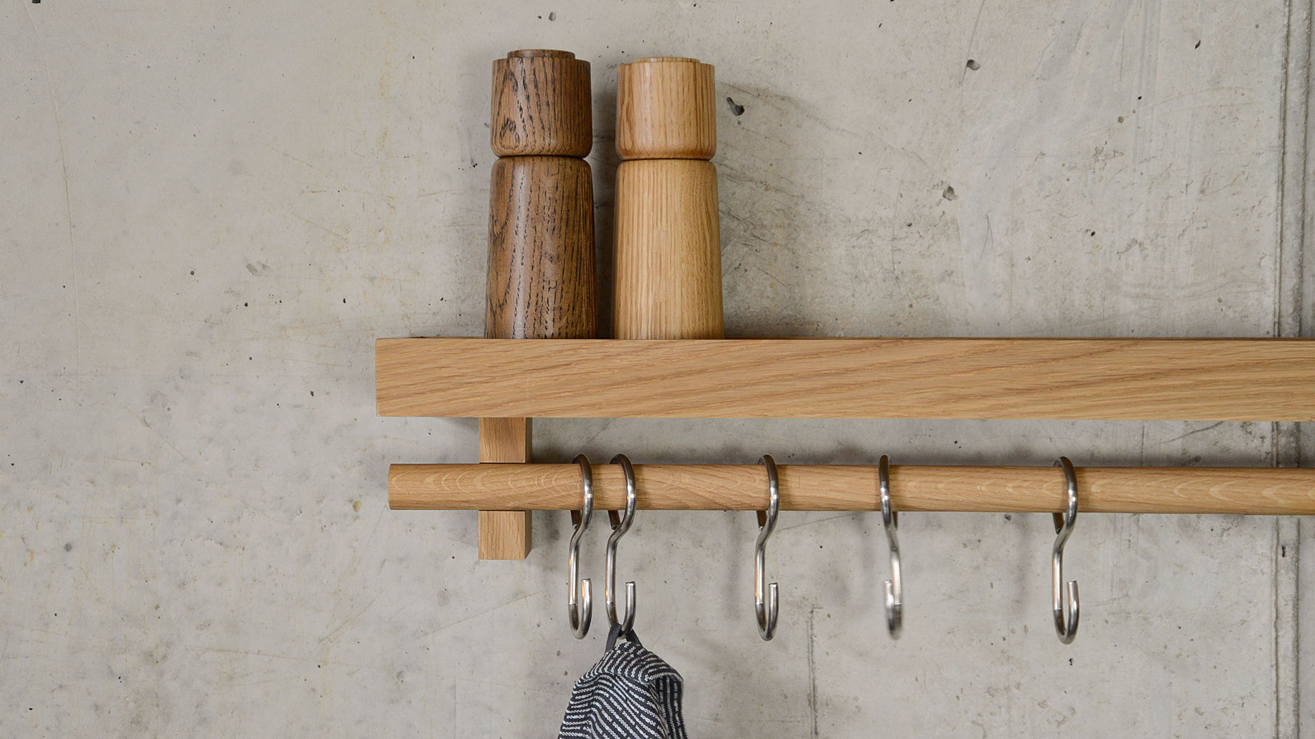 A natural oak, wall mounted, shelf with stainless steel hooks. Free up valuable drawer and cupboard space by hanging pans, utensils, dried herbs, a string of onions or garlic on this wall fixing utensils rail shelf.