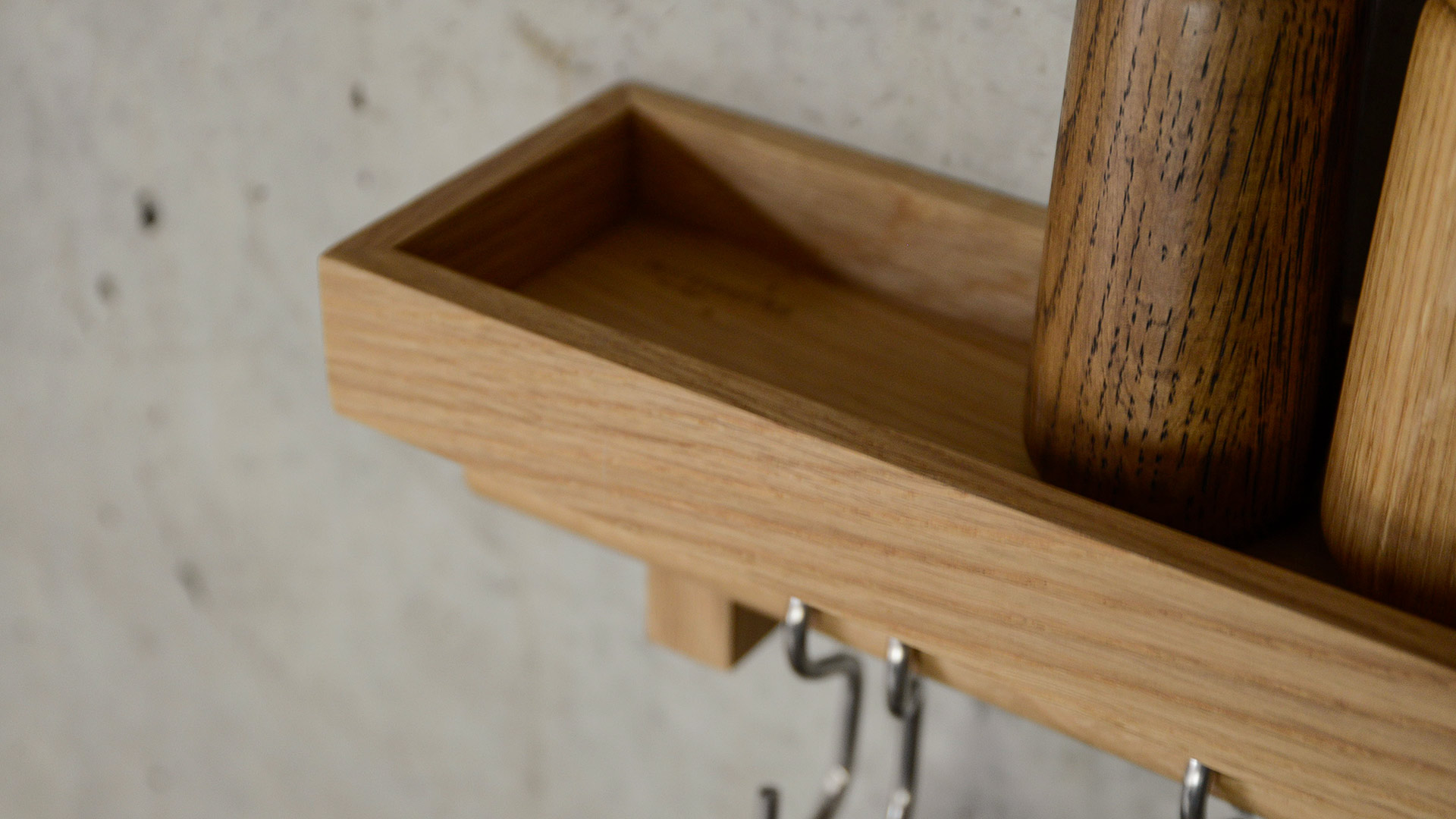 A stylish storage solution – this natural oak, wall mounted utensil storage unit comes complete with a stainless steel hooks. The five hooks move freely but are secured to the rail making it easier to use. There’s no risk of hooks falling off when trying to remove pans. The lipped edge shelf can be used to store bottles and condiments, keeping things conveniently close at hand.