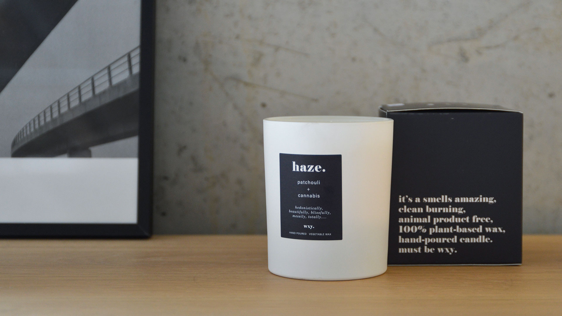 Scent – Haze: Patchouli + Cannabis A complex, smokey scent with sweet and woody notes. Think of a wood burning stove on a clear winters night. Colour: Ink