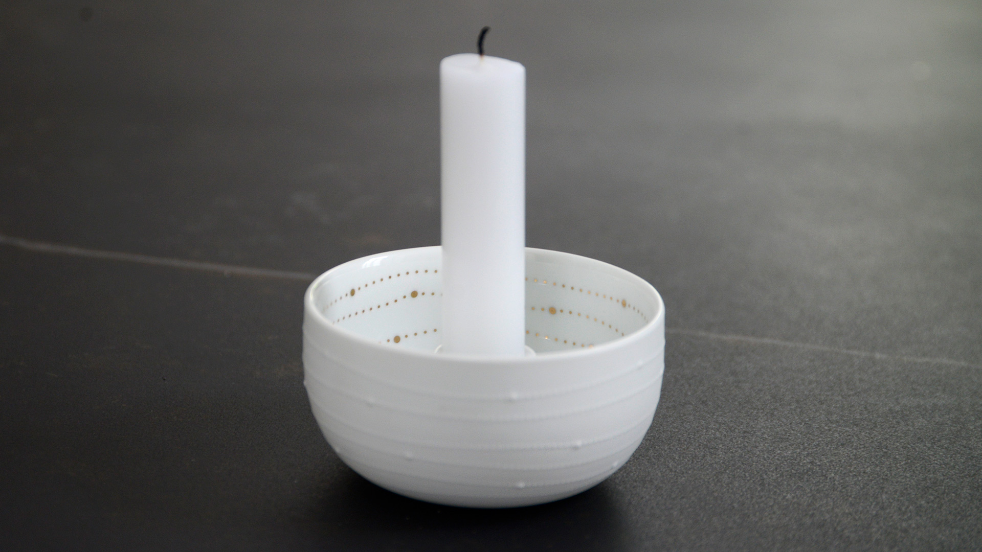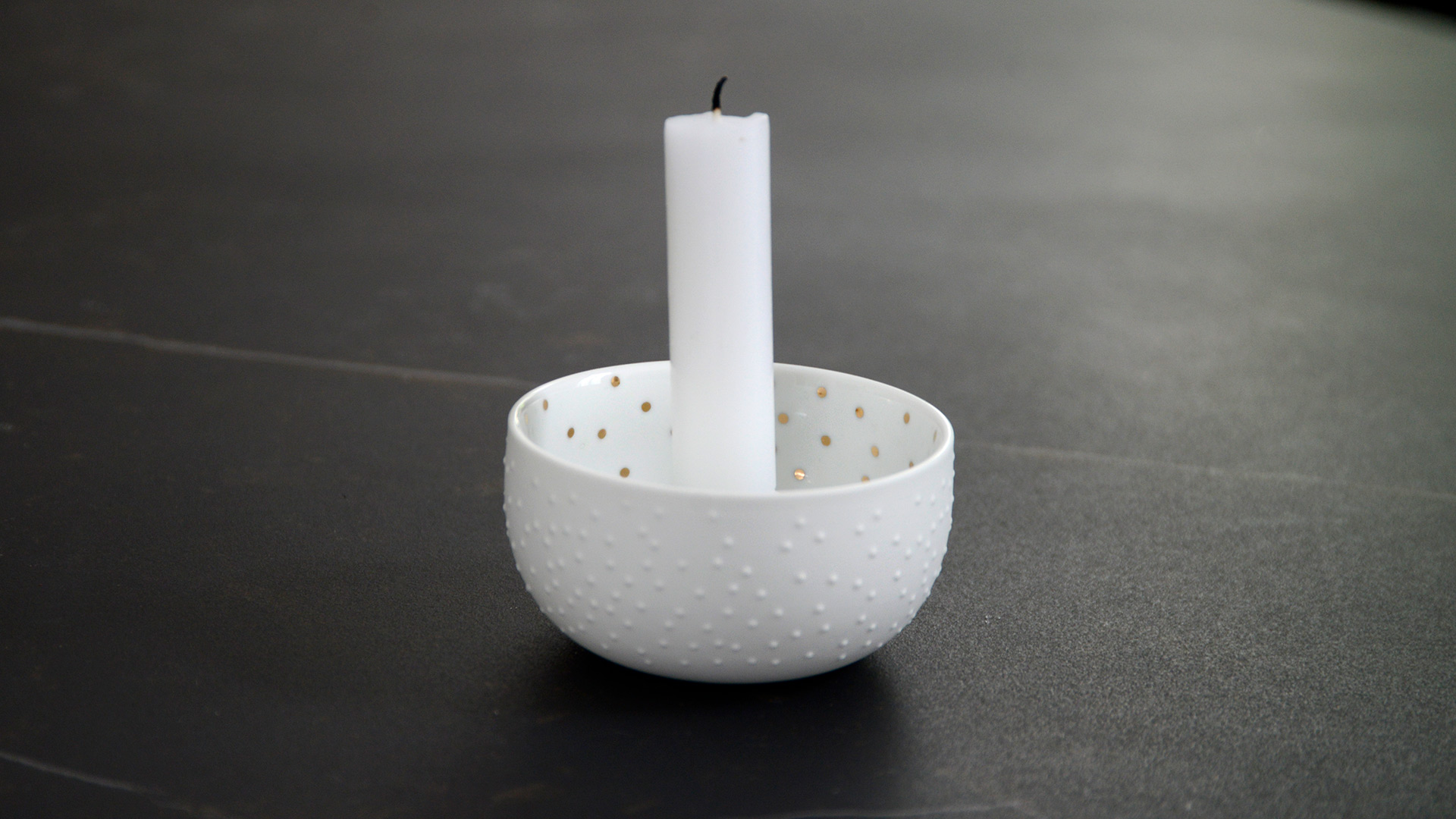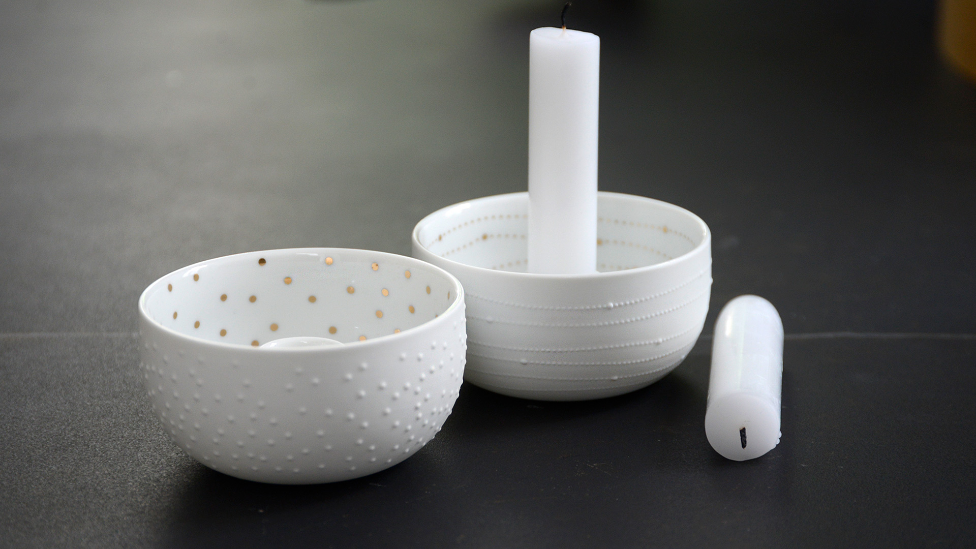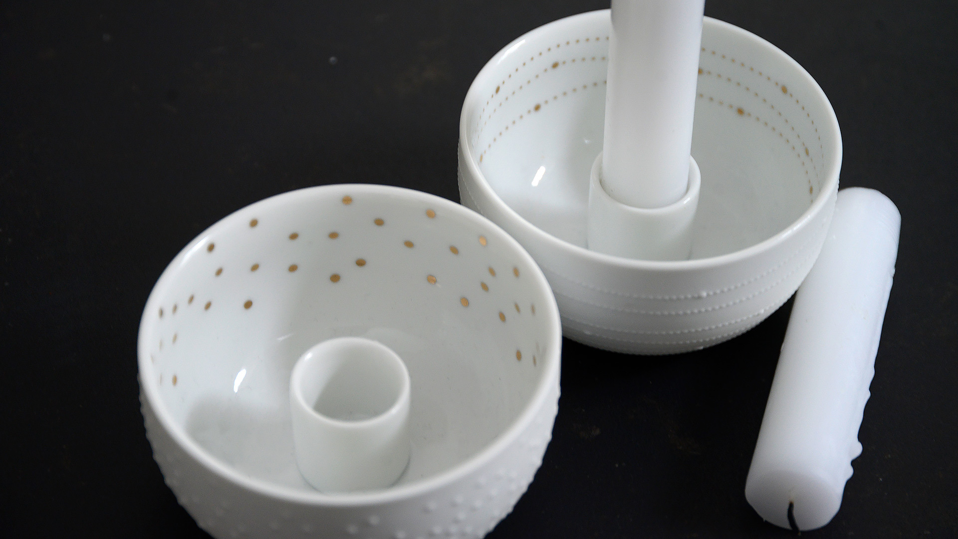 Sweet and simple bowl candleholders, made from matte white porcelain and highlighted with a gold pattern inside.