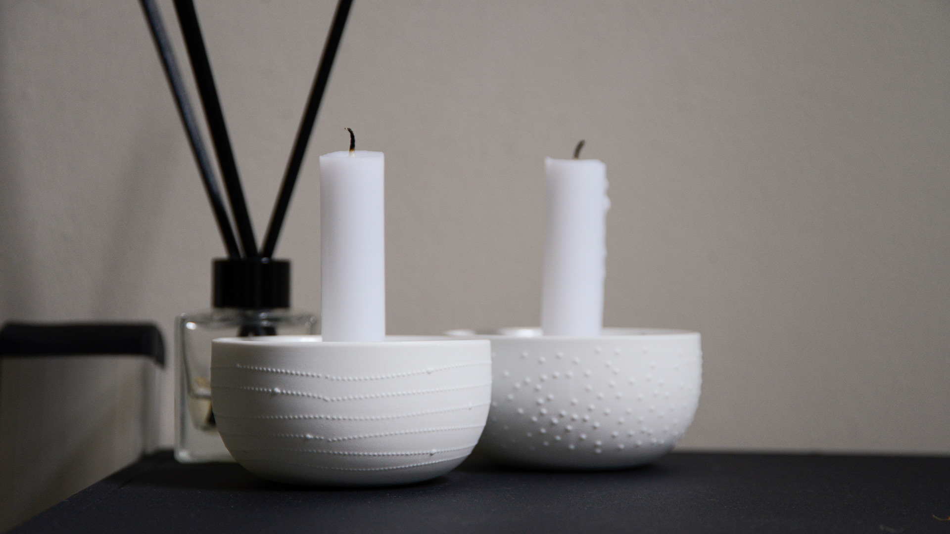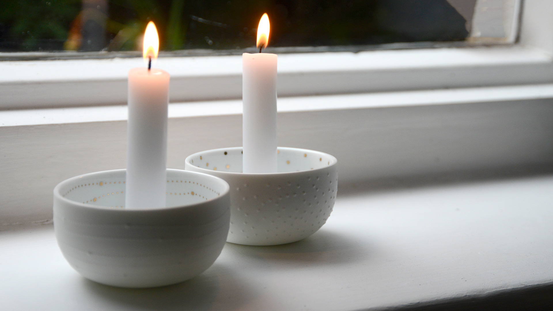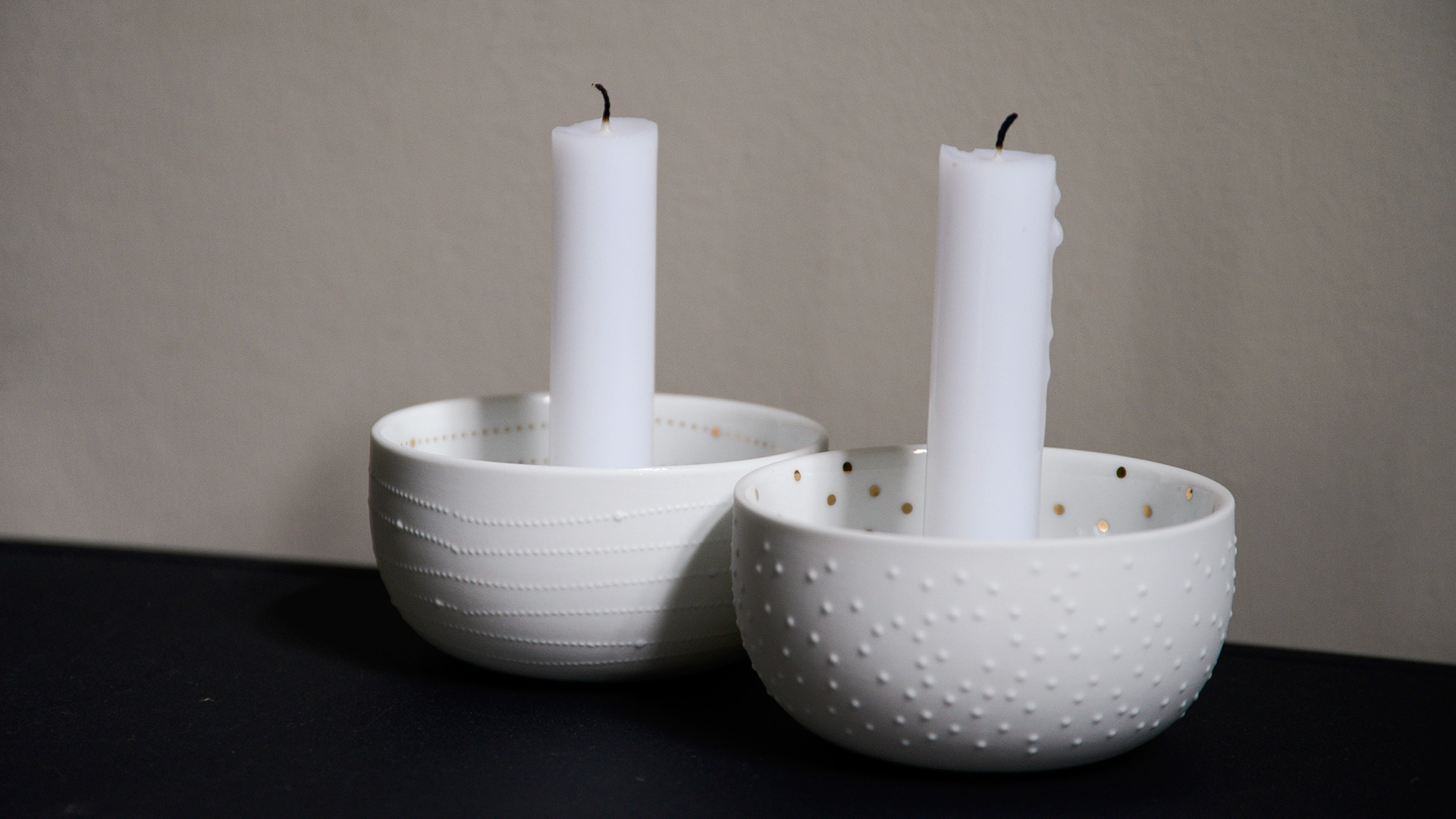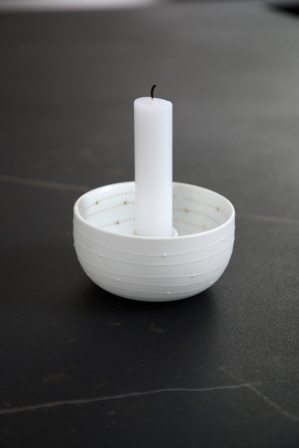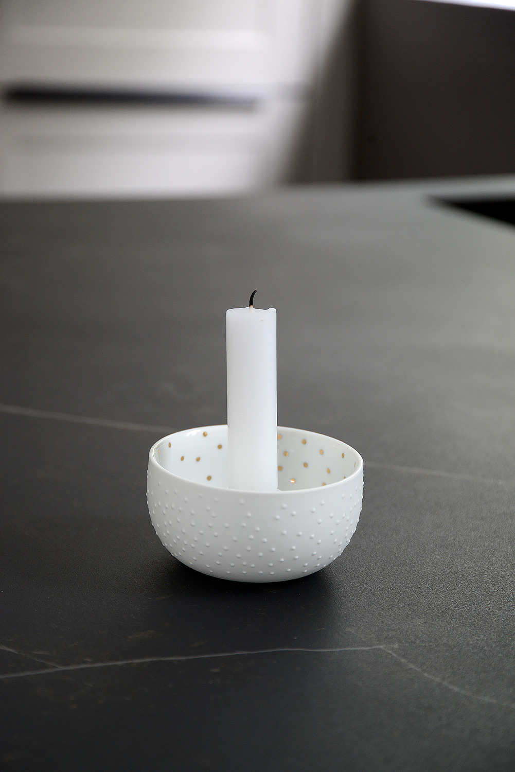 Sweet and simple bowl candleholders, made from matte white porcelain and highlighted with a gold pattern inside.