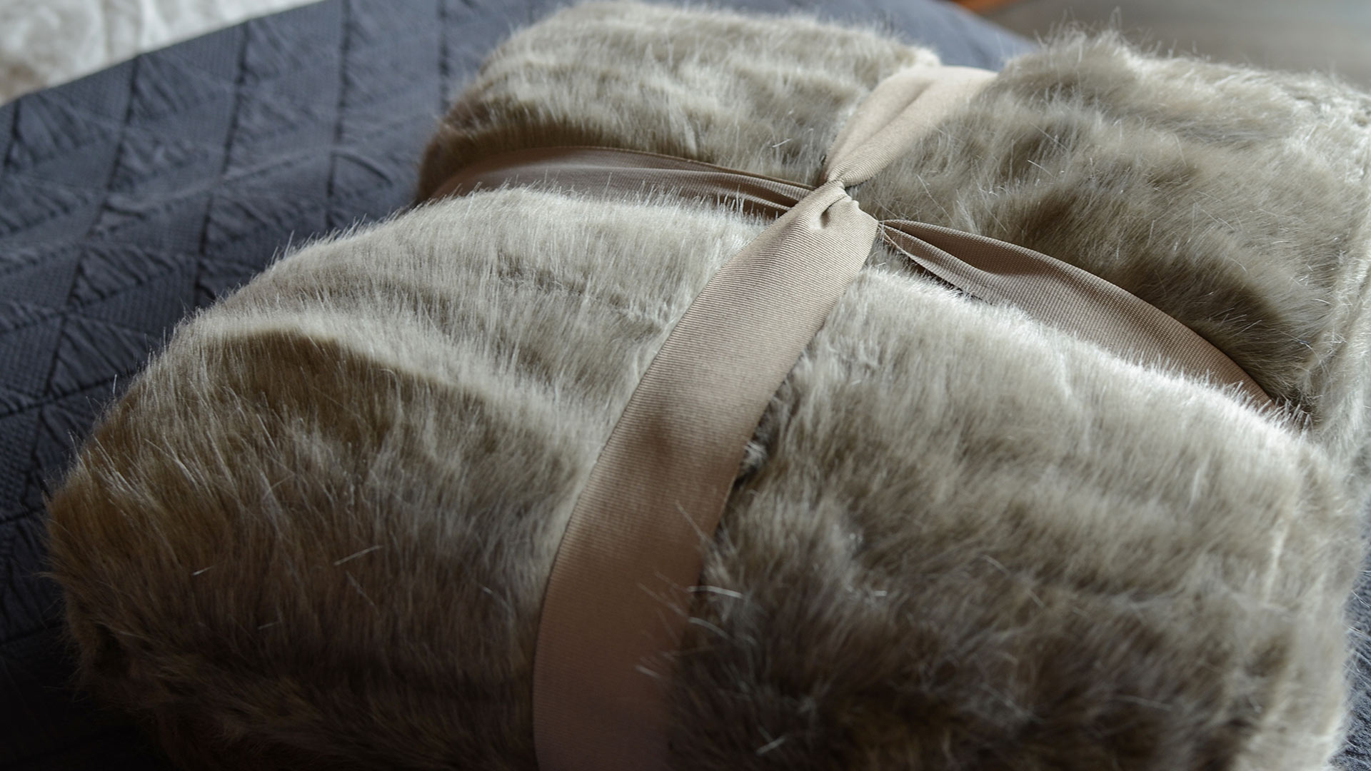 A new faux fur throw in a subtle and sophosticated Wild Mink colour. The ‘fur’ has a deep pile with a silver sheen that sparkles in the light. The reverse is in a soft ‘velvet feel’ fabric in a matching warm, mushroom grey colour.