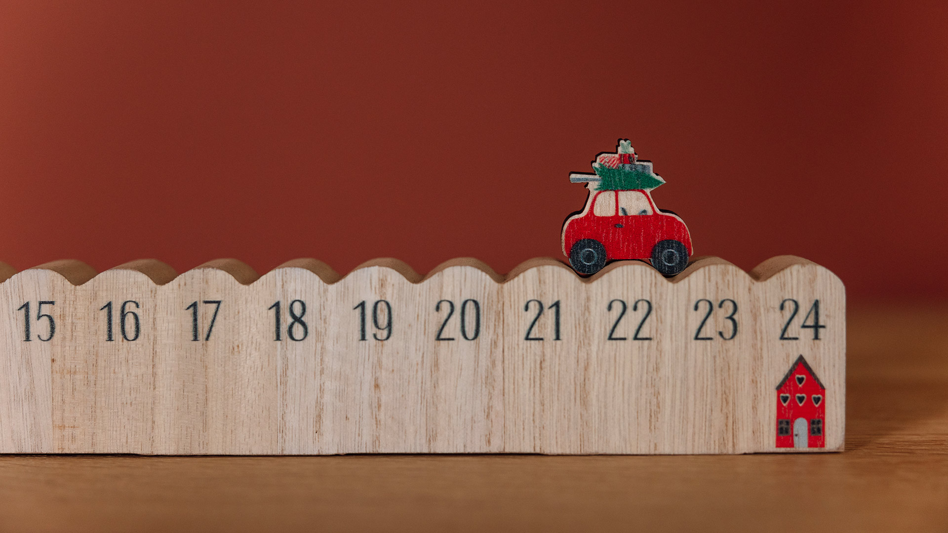 A cute and fun wooden advent calendar. This quirky calendar features a numbered base. Its car shaped counter trundles along each day until it reaches home on the 24th of December.