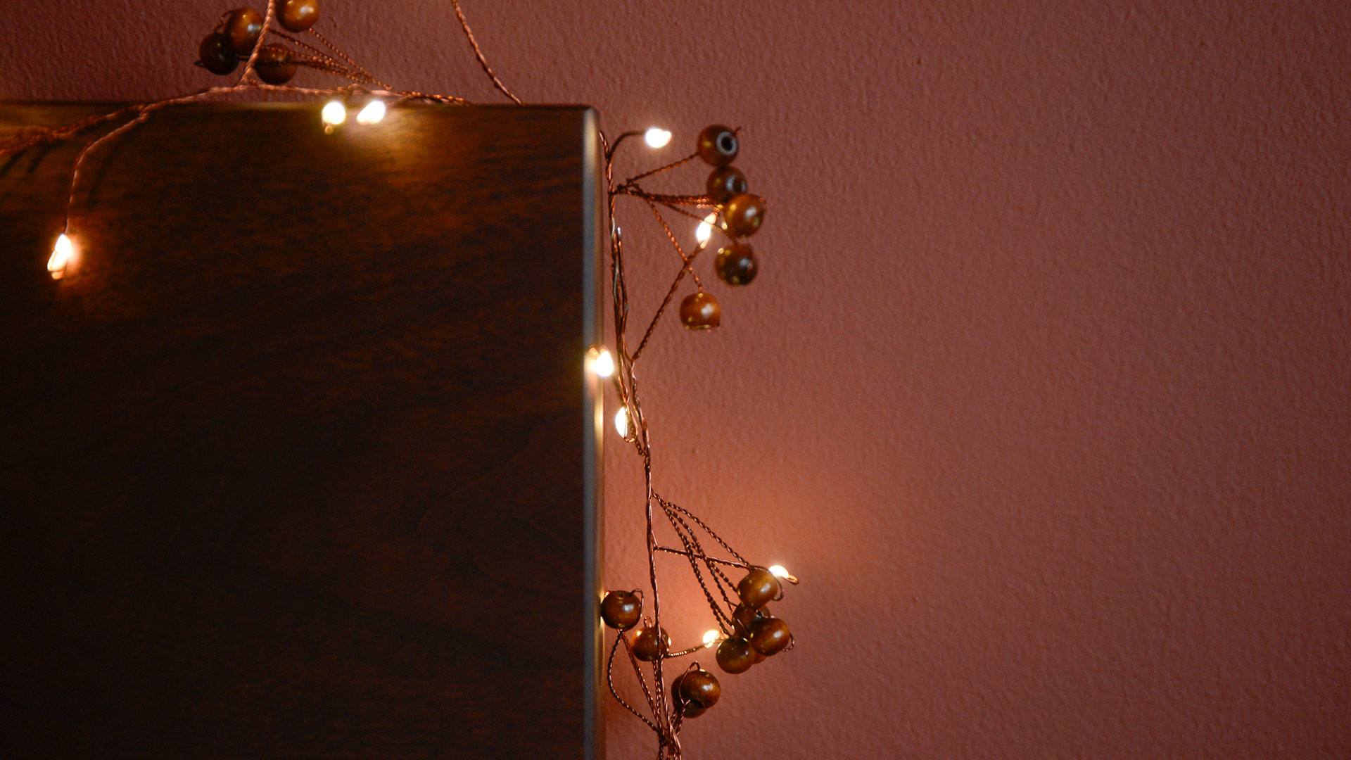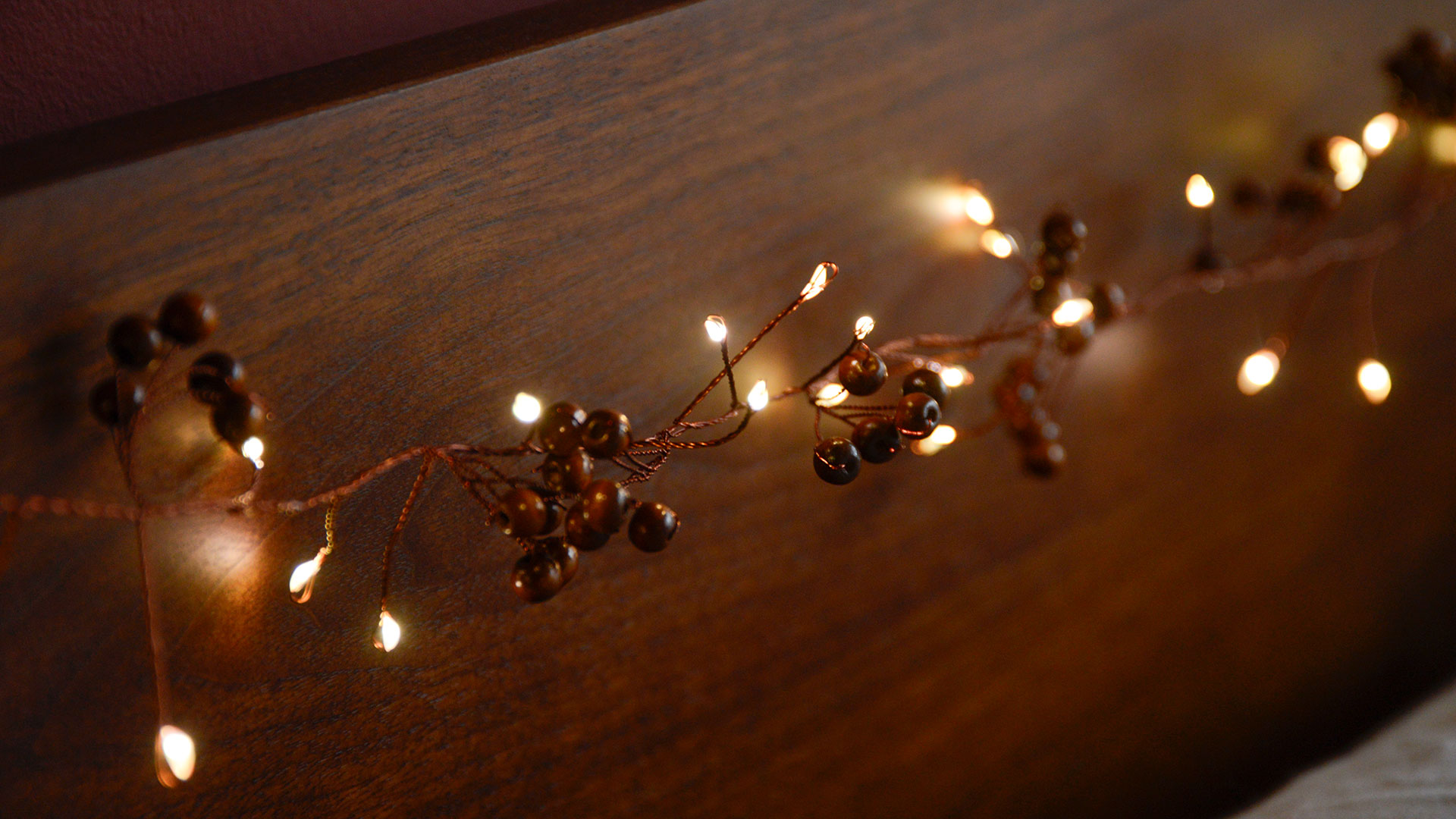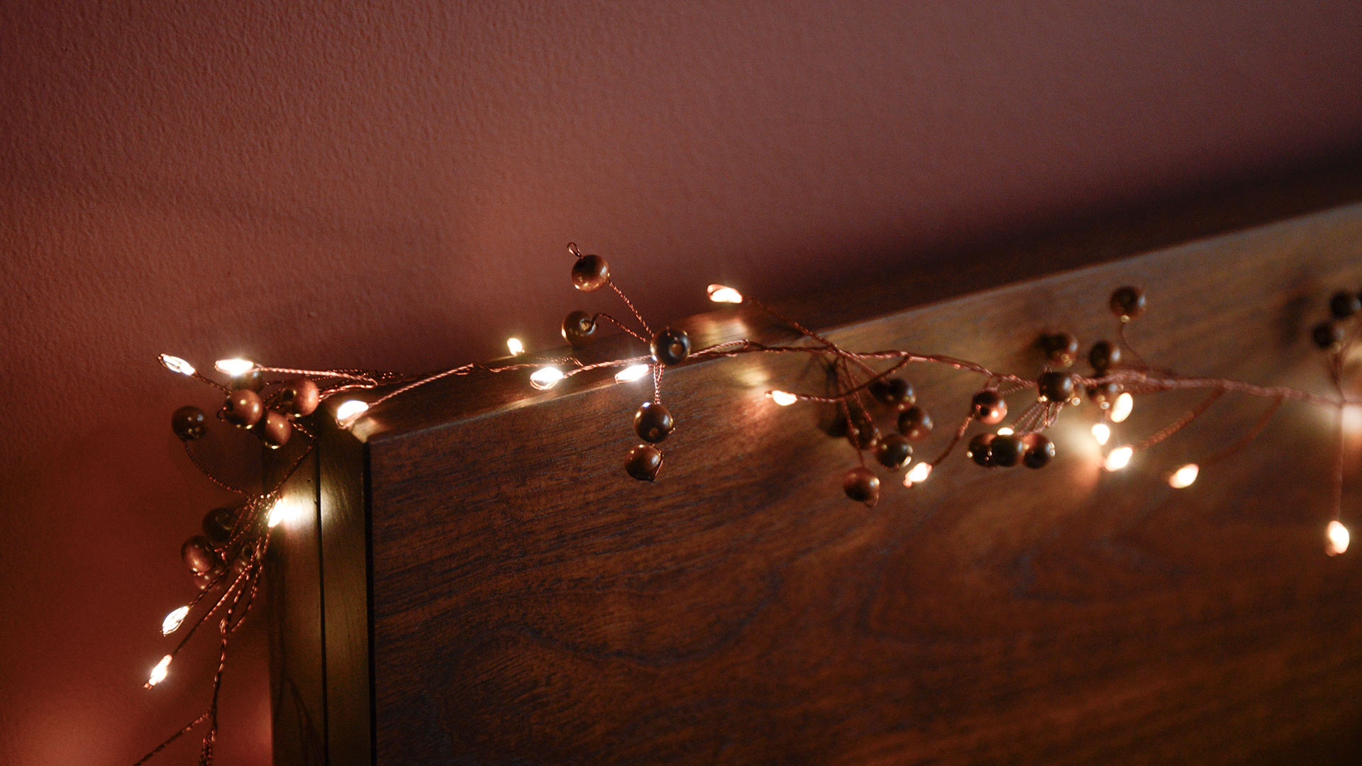 Whimsical and delicate, these light strings are made up of a cosy combination of wooden beads and mini LED lights. Inspired by winter woodland berries. With a warm, soft glow.