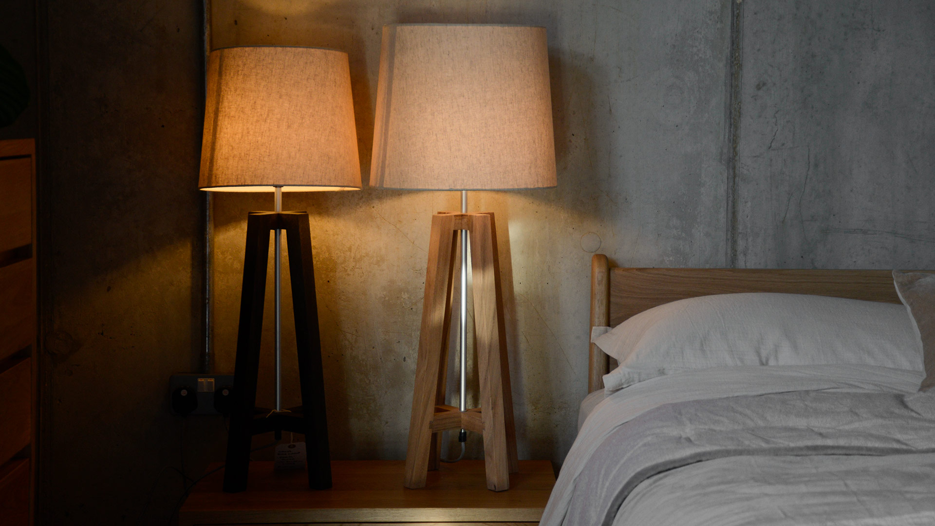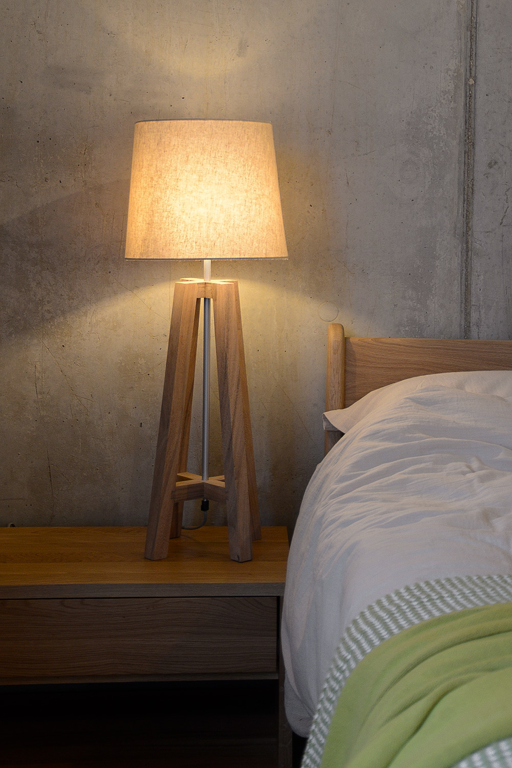 A contemporary wooden cross table lamp base with a fabric shade. The tall, solid base is available in two finish options: natural or ‘earth’ stain (a dark, cool brown colour). The fabric shade is a subtle ecru/biscuit colour.