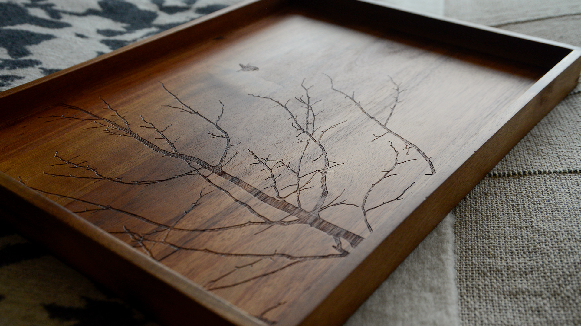 A modern wooden tray featuring an etched tree & bee design. A wonderful piece displayed on its own, or to support other accessories in the hall or kitchen, this tray is suitable for a variety of uses. Crafted in a traditional shape with a shallow lip, this wooden tray is a useful and stylish item with a unique design.