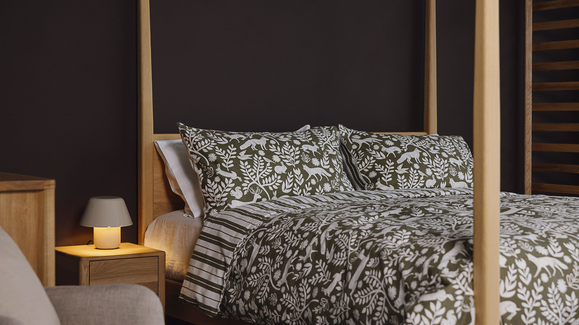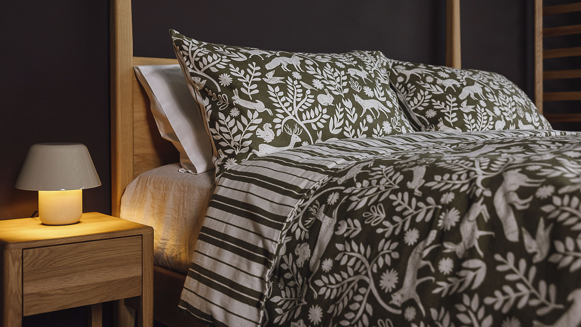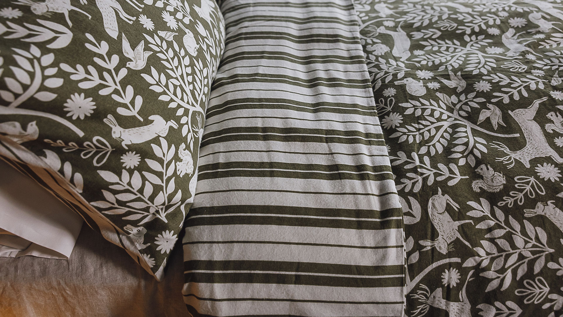 This gorgeously cosy, olive green and soft white brushed cotton duvet set is available in double, king and super-king sizes. Each set contains two 50x75cm matching pillowcases. Featuring woodland creatures on the front, and a modern stripe to the reverse, this super soft bedding is perfect for autumn-winter.