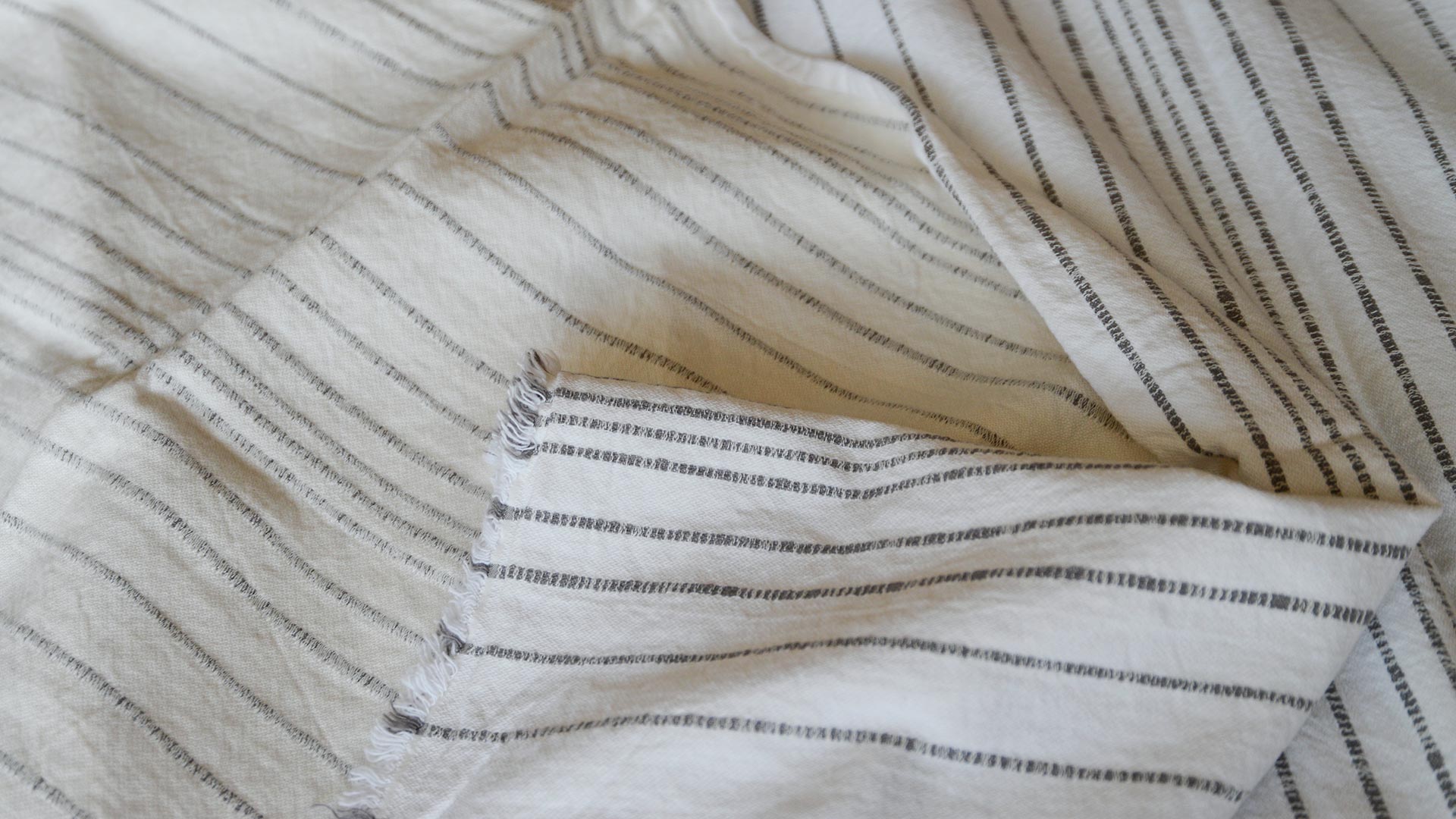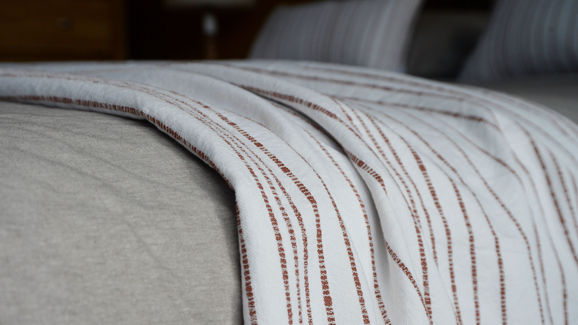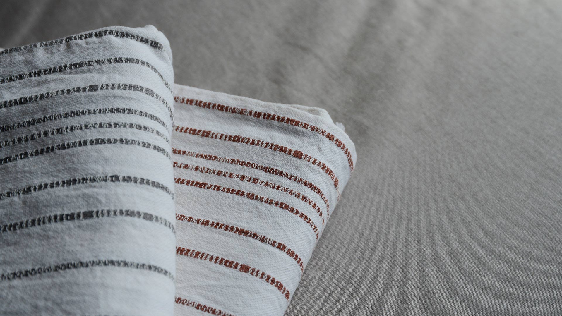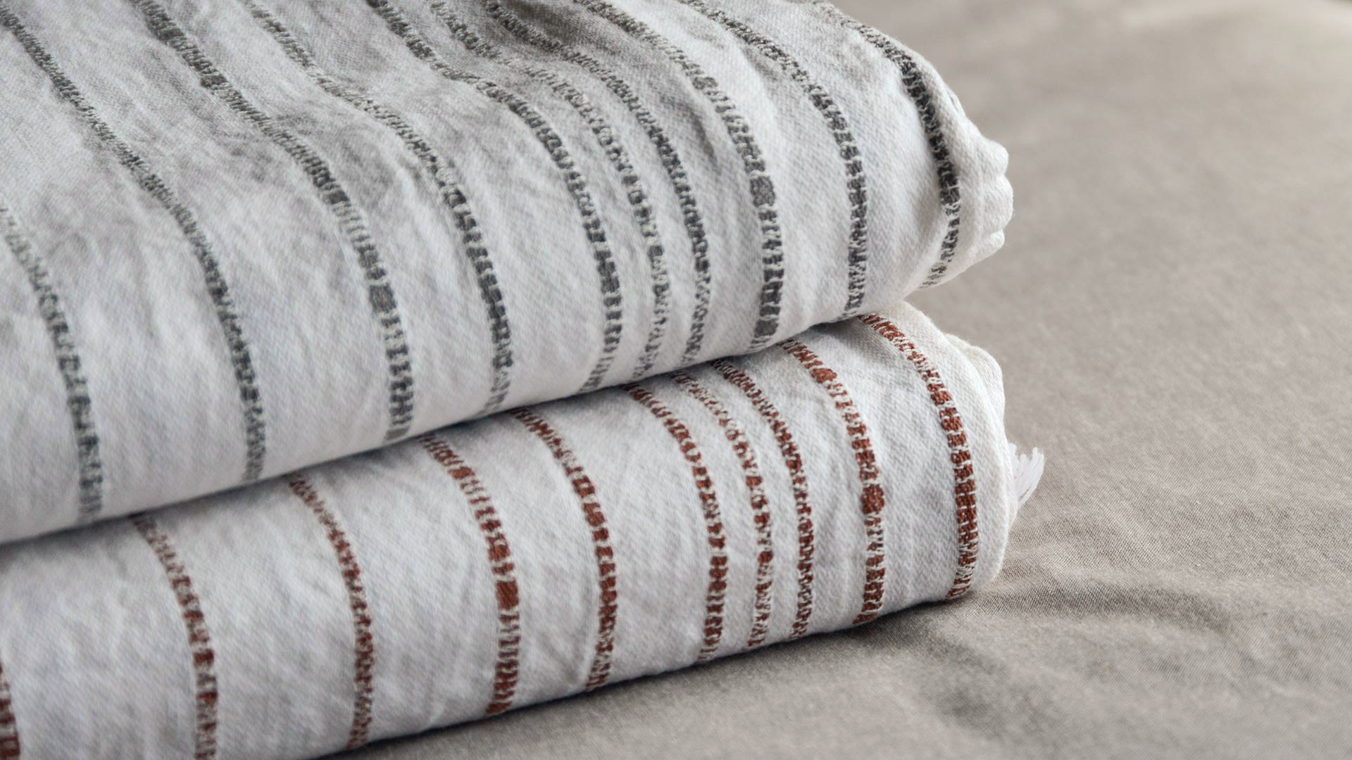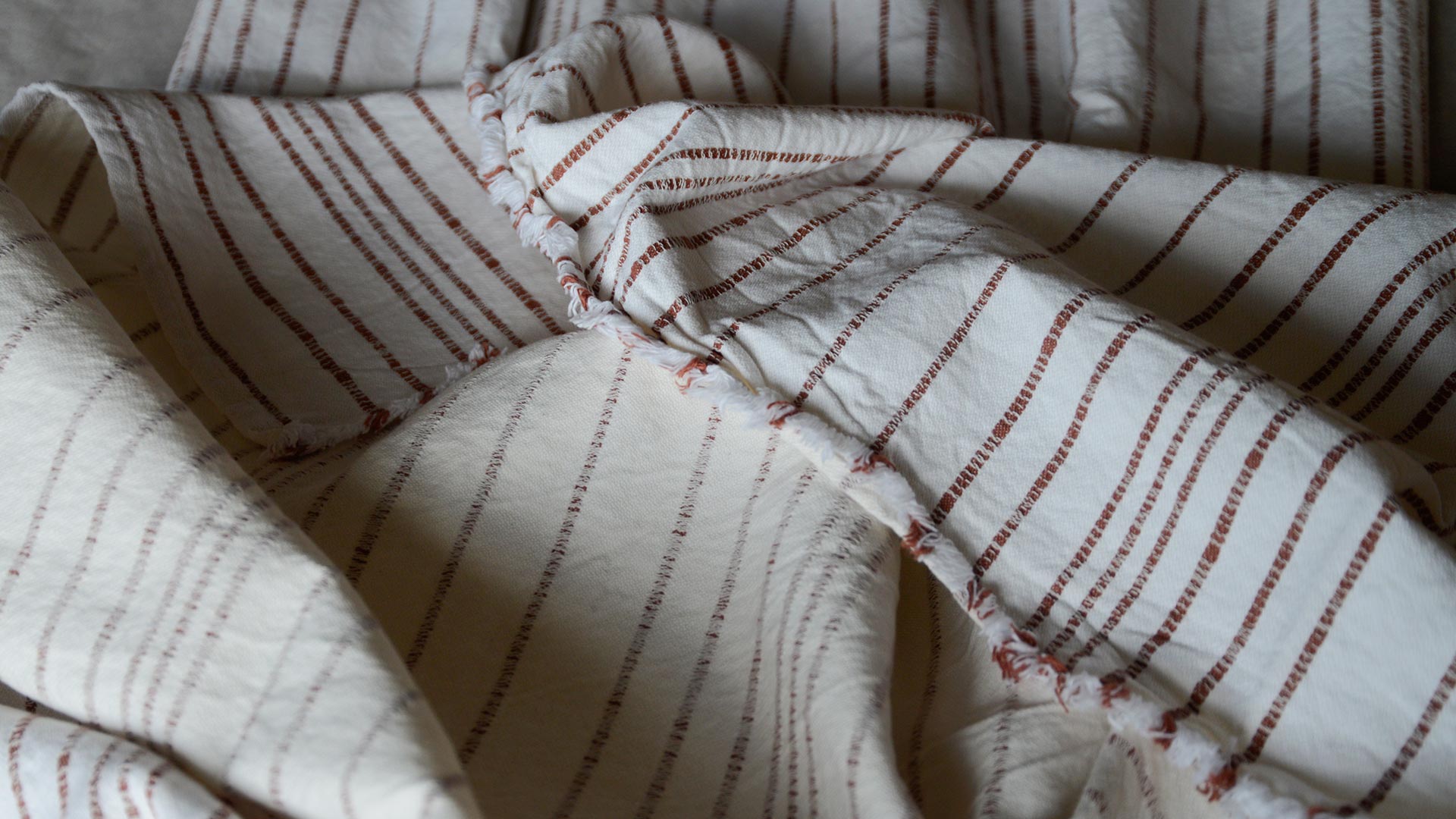 Terracotta: Deep rusty red-brown stripes woven into a bright ivory white background Charcoal:Â Mid charcoal grey stripes woven into a bright ivory white background
