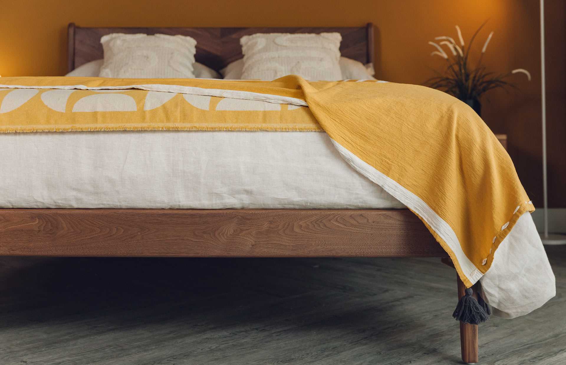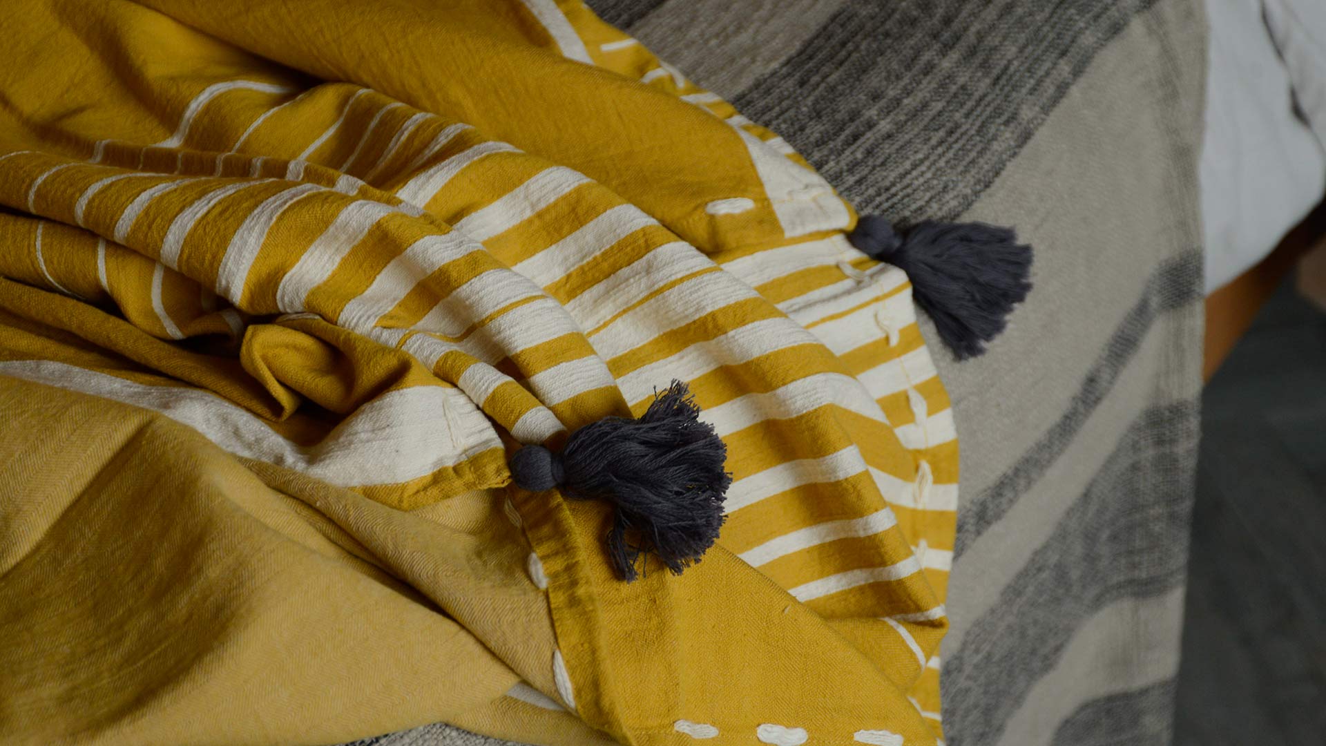 A large, soft throw in pale ecru and vibrant, deep yellow. Complete with a charcoal grey tassels to each corner and an ivory stitch detail.