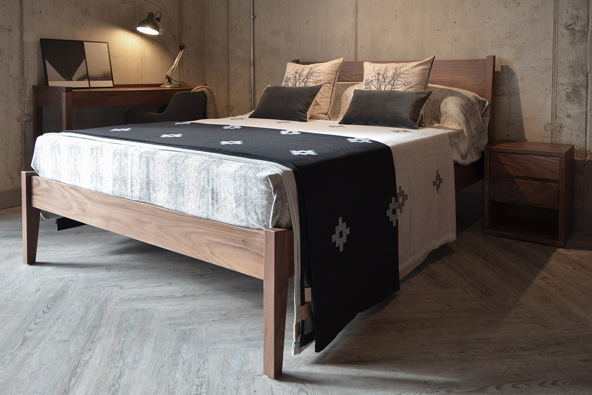 A real favourite with our customers, the Zanskar boasts classic, mid-century style, with a contemporary twist. It’s sleek side rails and large headboard panel are the perfect platform to show off the tones and grains found in natural timber, which all our beds are made from. This bed features a sloping headboard – perfect for reading or curling up in bed.